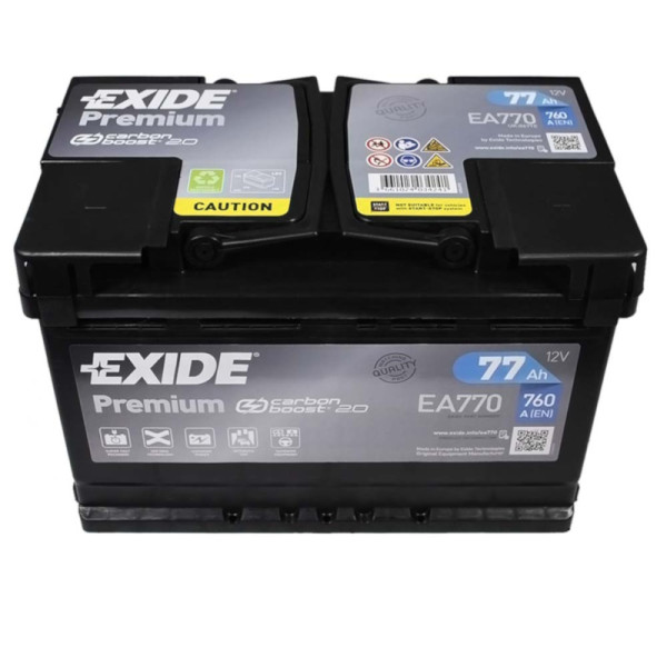 Акумулятор Exide 77Ah 760A Premium / EA770 має технологію Carbon Boost 2.0, це означає, що він заряджається в 2 рази швидше порівняно з іншими, звичайними батареями завдяки технології, що запентована компанією Exide, що полягає у внесенні вуглецевих добавок в активну масу негативних пластин.